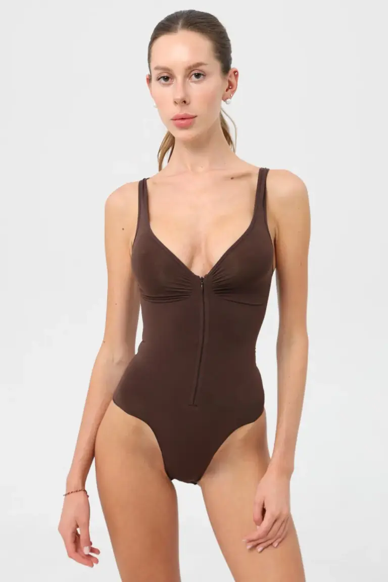 Преміальний боді з глибоким вирізом і елегантною відкритою спиною. Силует щільно прилягає до тіла, підкреслюючи лінії фігури, при цьому забезпечує
